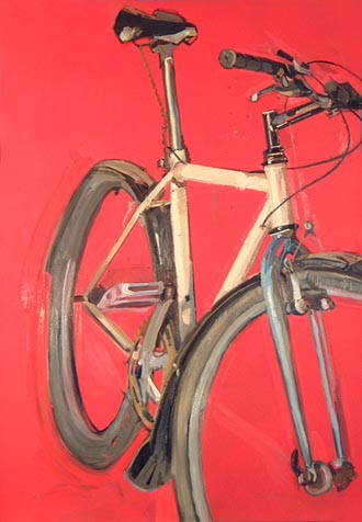 Noah's Rain Bike 5 December 24, 2002 Oil, on paper , 39 x 27" Show Scale This cropping makes me think of those wonderful Degas paintings where the horses are leaving the picture. <-- [studio] -->