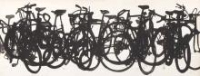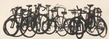 Bikestack Monotypes 2009 Relief Monoprint on paper 11x30 and 22 x 30" I made rubber cutouts of the bikes from my painting. Printed together they look like the heaps locked outside of a party.