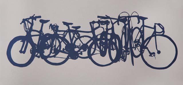 Bikestack Midi 01 6 <-- [studio] --> Bikestack Midi 01 6 September 24, 2012 Screenprint , 9 x 19" 11 Black ink on brown Stonehendge paper Printed 11 $50.00 Quantity Add to cart