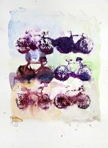 New Rainy Day Bicycles 11 Screenprint, Watercolor, on paper , 23 x 17" Show Scale Private Collection <-- [studio]