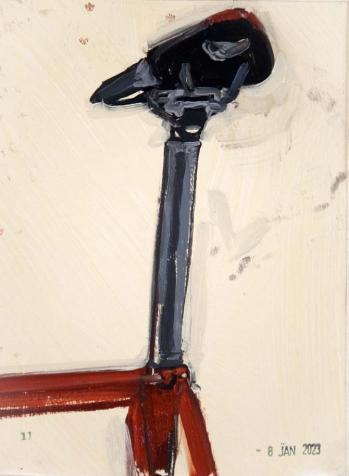 Eddie's Bike Sketches 2023 11 Oil on paper, 8 x 6" Show Scale Private collection I try and try and often like things more later in spite or because of the clumsyness. <-- [studio] -->