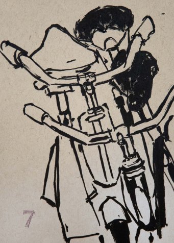 Odds and Ends 2025 7 December 26, 2025 Ink on paper, 7 x 5" Show Scale A sketch in brush pen on French brand paper, a brown heavy card a selection of the bunch of bikes by the commodites dept. The ladies Spaceliner, the Fleet and the drysdale <-- [studio] -->