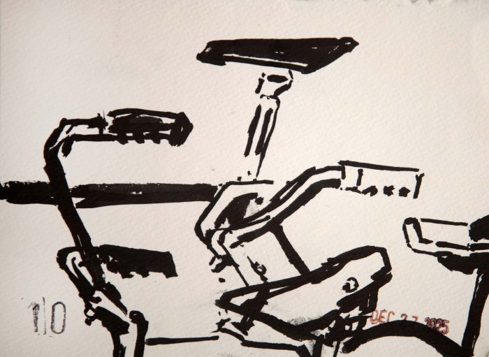 Odds and Ends 2025 10 <-- [studio] --> Odds and Ends 2025 10 Ink on paper, 6 x 8" Show Scale A sketch in brush pen on a quite heavy white textured printmaking paper. I think it is Arches. a selection of the bunch of bikes by the commodites dept. Eddie's,The ladies Spaceliner and the Fleet.