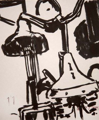 Odds and Ends 2025 11 Ink on paper, 7 x 6" Show Scale A sketch in brush pen on Stonehenge gray a selection of the bunch of bikes in the front of the loft, Simon's Humber and friend. <-- [studio] -->