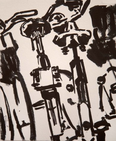 Odds and Ends 2025 15 Ink on paper, 7 x 6" Show Scale A fifth and last (for now), sketch of the same view in brush pen on Stonehenge gray a selection of the bunch of bikes in the front of the loft, Simon's Humber and friend. <-- [studio] -->