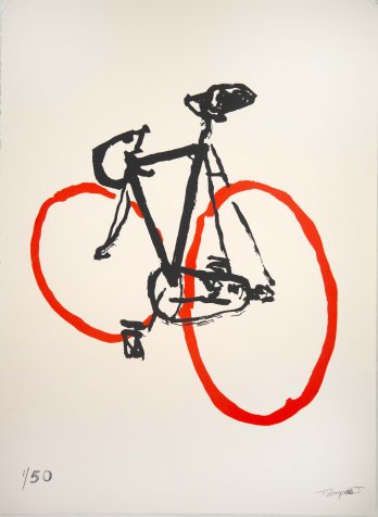 This poster-sized two-color screenprint captures the elegant balance of motion and pause—a moment suspended, like a rider hovering at a red light, not quite still but fully grounded. Bold black lines sketch out the geometry of a bike, while loose red circles hum with energy.