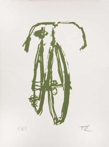 This print comes from the same set of Drysdale bike sketches as the last one, drawn with quick, lively lines that keep the energy of the moment. Printed in a soft gray-green on vintage Arches Cover, the color feels both fresh and grounded.