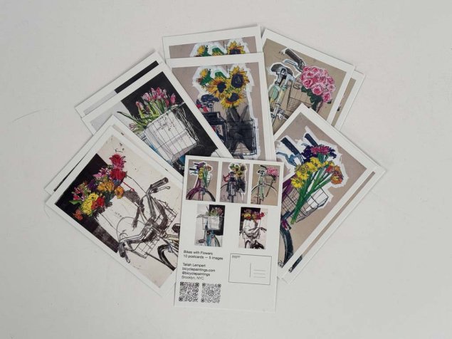 This set of ten postcards features five Bikes with Flowers, two of each image. The postcards are printed at 4×6 inches on sturdy, high-quality cardstock, making them perfect for sending, collecting, or tucking into a frame.