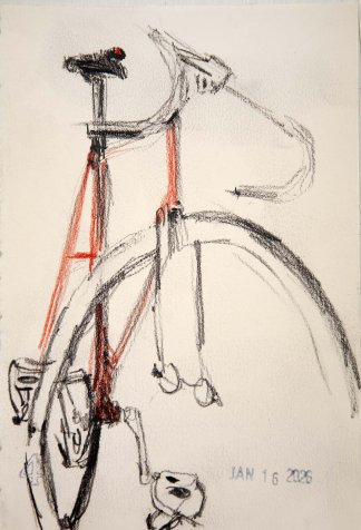 Eddie's Bike 4 Mixed Media on paper, 8 x 5.50" Show Scale another dry media sketch study before starting litho plate to get my thoughts together <-- [studio] -->