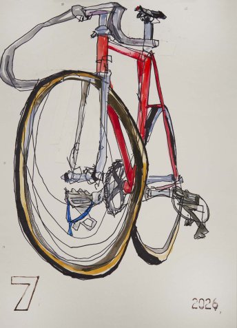 This is a scribble drawing, letting the line move quickly and stay loose. Built up with ink and watercolor, it holds onto that first look — a little unstable, a little searching — but still finding the structure of the bike.
