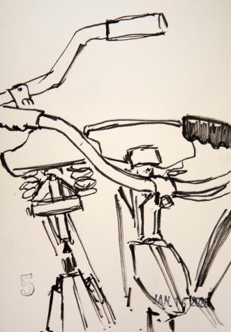 Loft Bike Vignettes 5 January 16, 2026 Ink on paper, 8 x 5.50" Show Scale the two Spaceliners. I love how they relate to each other. <-- [studio] -->