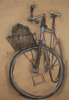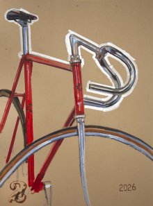 Eddie was a messenger long before I met him, always a friendly voice in the city’s cycling world. After he died about ten years ago, his bike came to live in my studio, where it has remained a favorite muse. This painting is part of my ongoing “unfinished finished” series, I stop before fully describing the image, leaving i some areas open like a glance.